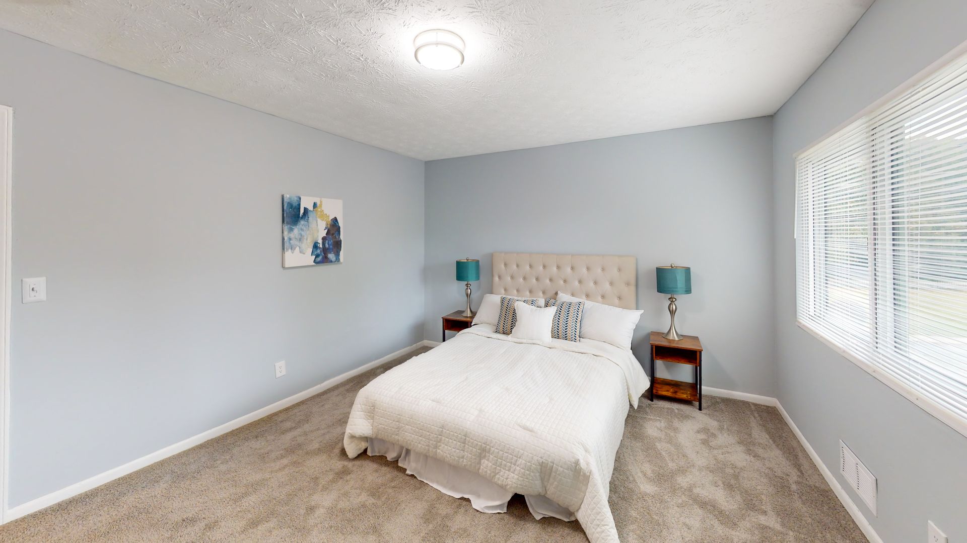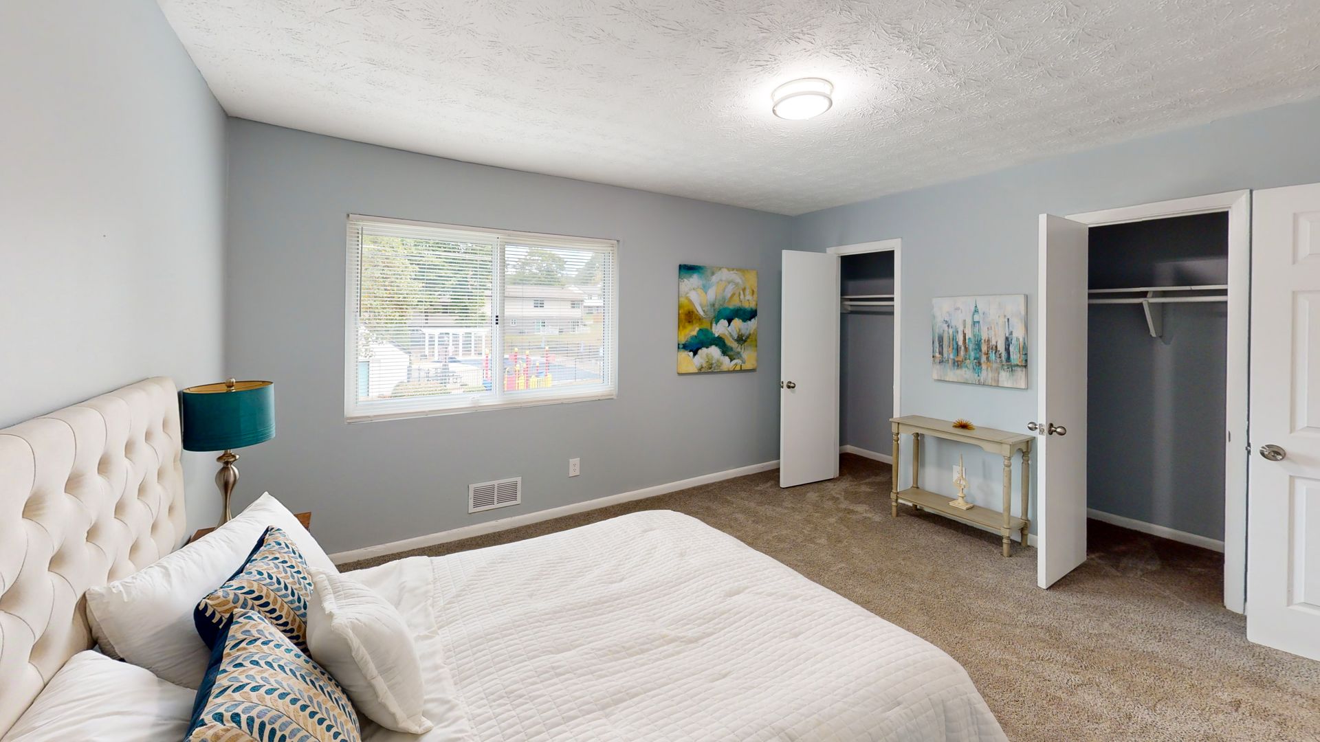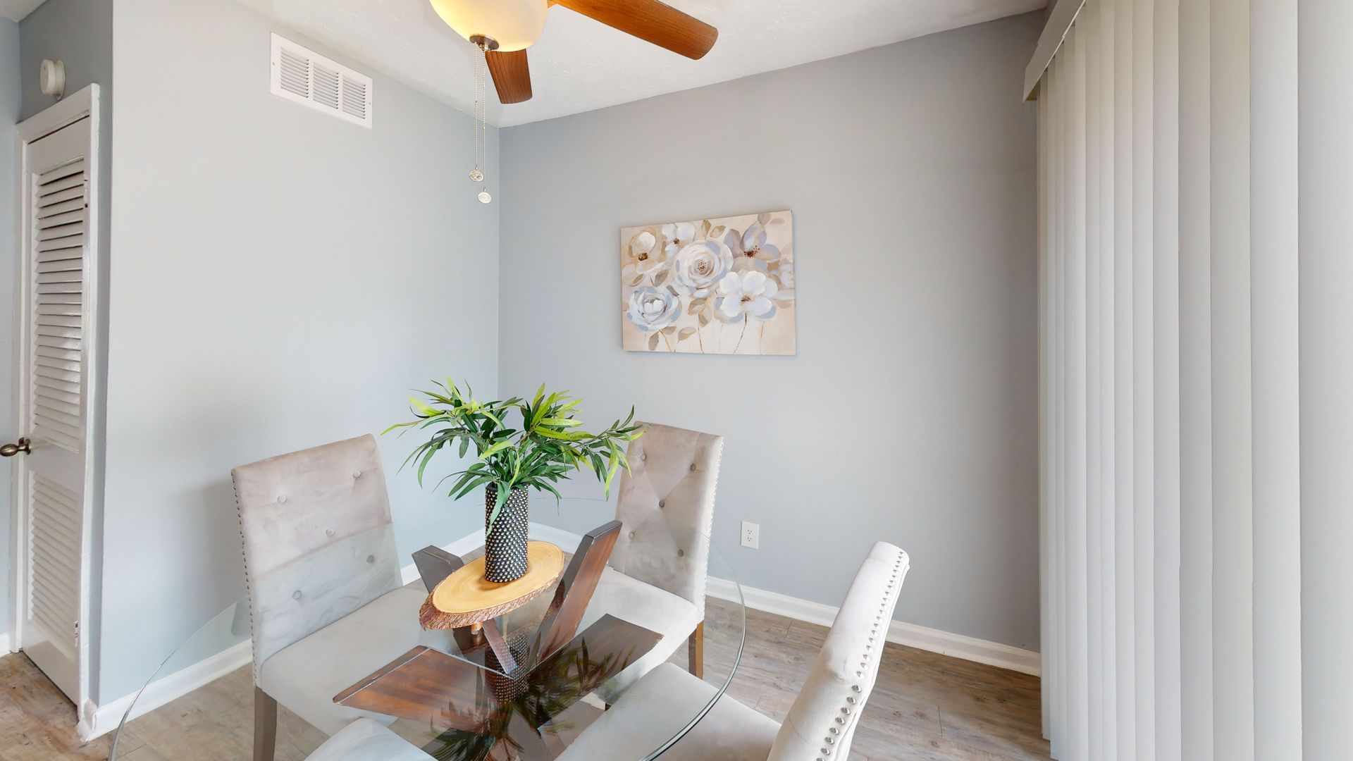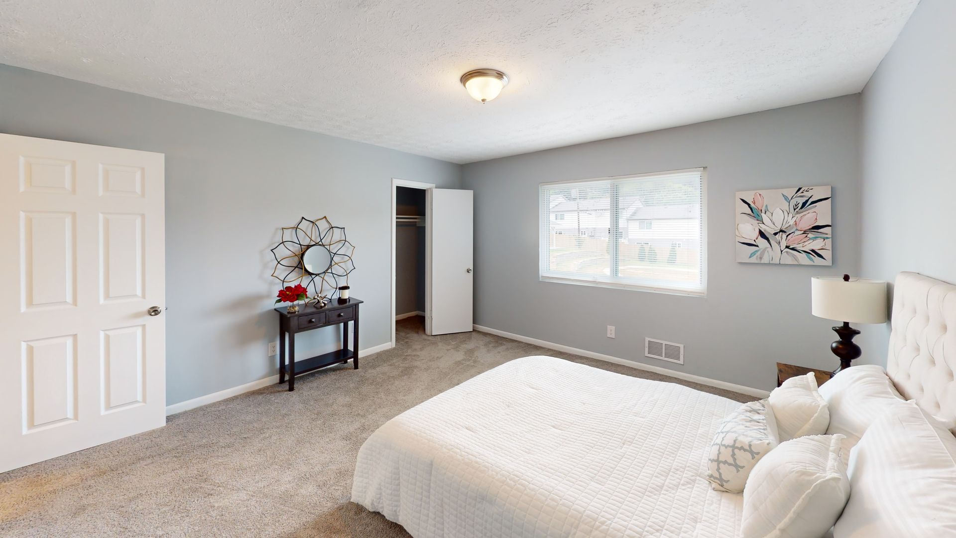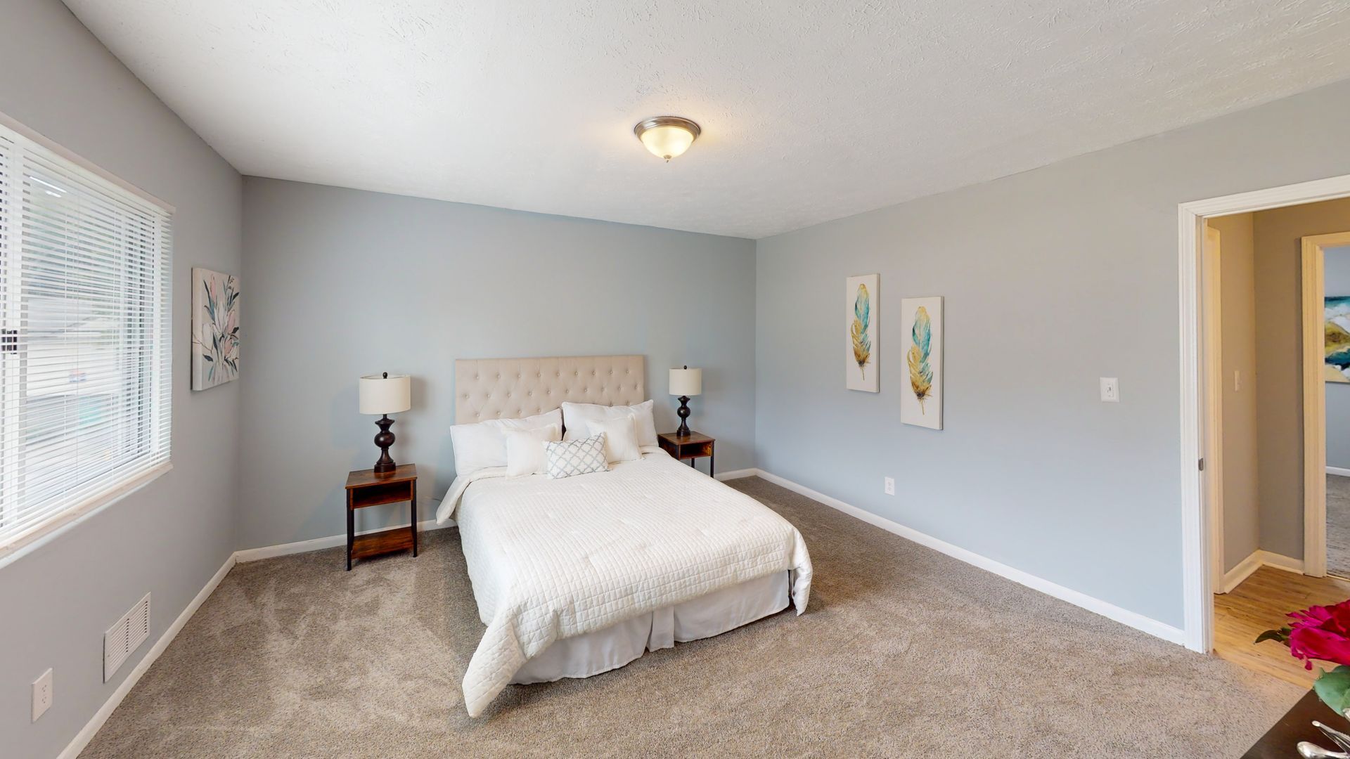 The bedrooms are generously sized with plush carpeting and ample natural light. Bathrooms feature modern fixtures and granite vanities. Additional amenities include a ceiling fan, sliding glass doors leading to an outdoor space, and strategically placed artwork that adds character to each room. With its modern design and functional layout, this townhouse offers a comfortable and stylish living experience.